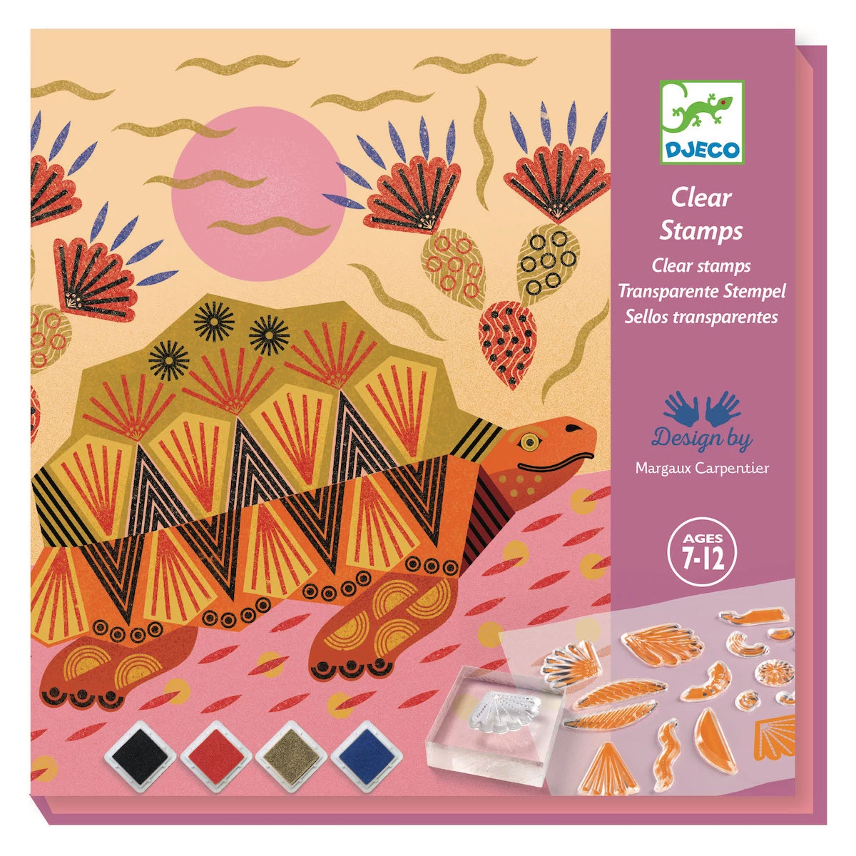 Ces tampons transparents sont ingénieux : vous voyez votre création au fur et à mesure et cela vous permet de bien positionner votre pochoir – le résultat est étonnant ! Contenu de la boîte : 4 feuilles à compléter (20 x 20 cm), 1 feuille de tampons souples et transparents, 1 bloc de positionnement lourd et épais pour faire l’empreinte sans que le tampon ne bouge, 1 tapis de nettoyage, 4 tampons encreurs ultra lavables (noir, bleu, rouge, or), 1 boîte à fermeture élastique pour ranger le matériel une fois l’activité terminée et 1 livret d’instructions pas à pas en couleurs.