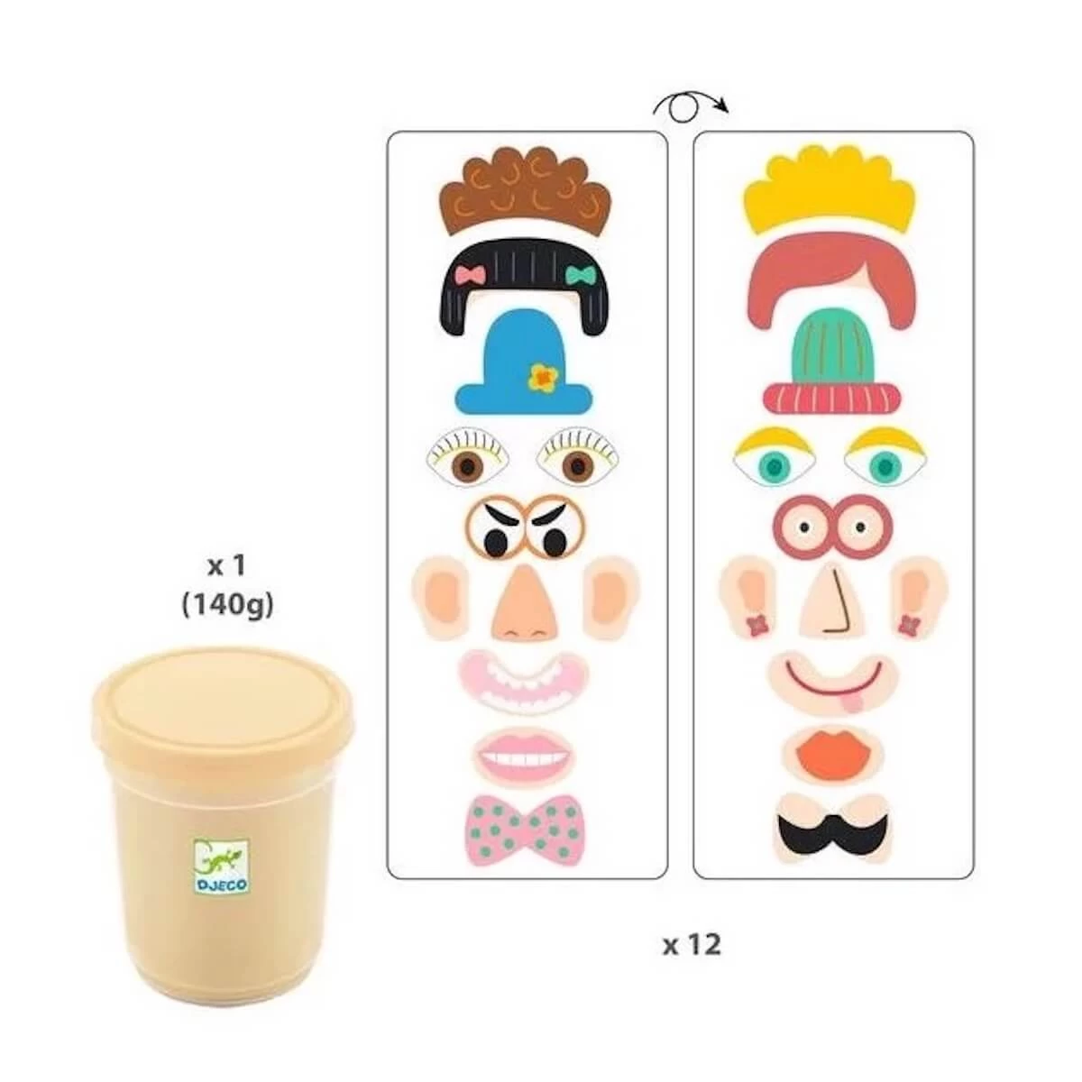 Coffret pâte à modeler Mapatabouilles de Djeco. L’enfant s’amuse à étaler, à rouler, à utiliser la pâte à modeler pour créer des formes de différentes tailles. Il complète ses créations avec les pièces en bois illustrées recto-verso pour qu’elles prennent soudain la forme de drôles de personnages. Une fois terminé, il retire les pièces de la pâte et il peut recommencer autant de fois qu’il le souhaite.