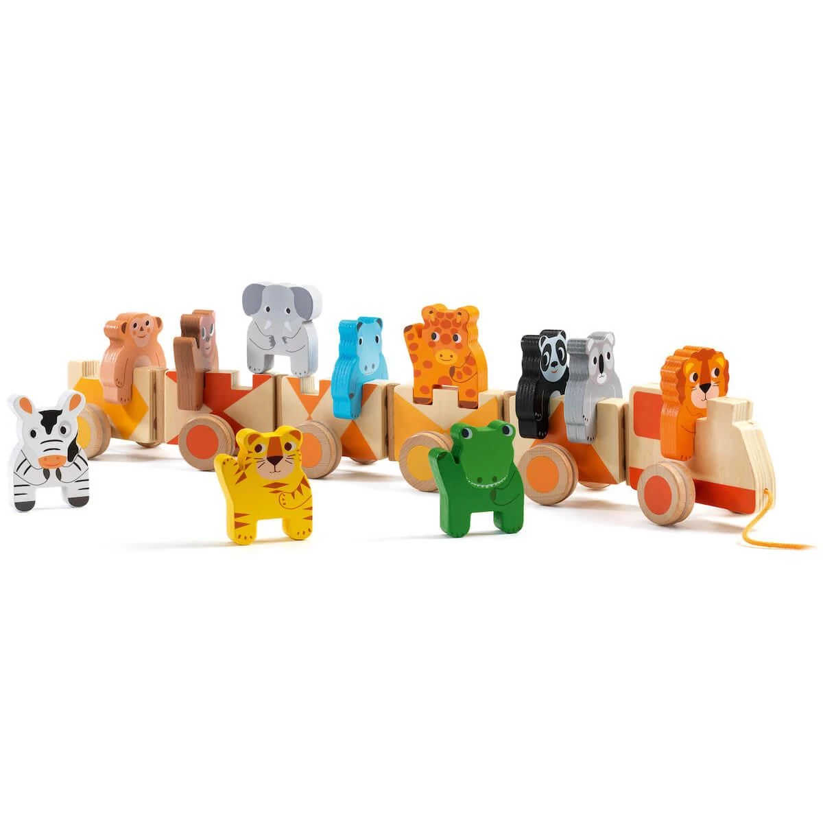 Un grand train coloré, en bois, avec des passagers animaux de la jungle. L’enfant s’amuse à placer les 11 animaux sur les 6 wagons et les promène à l’aide du lacet. Lorsqu’ils descendent du train, les animaux tiennent debout et l’enfant peut s’amuser à jouer avec autant qu’il le souhaite !