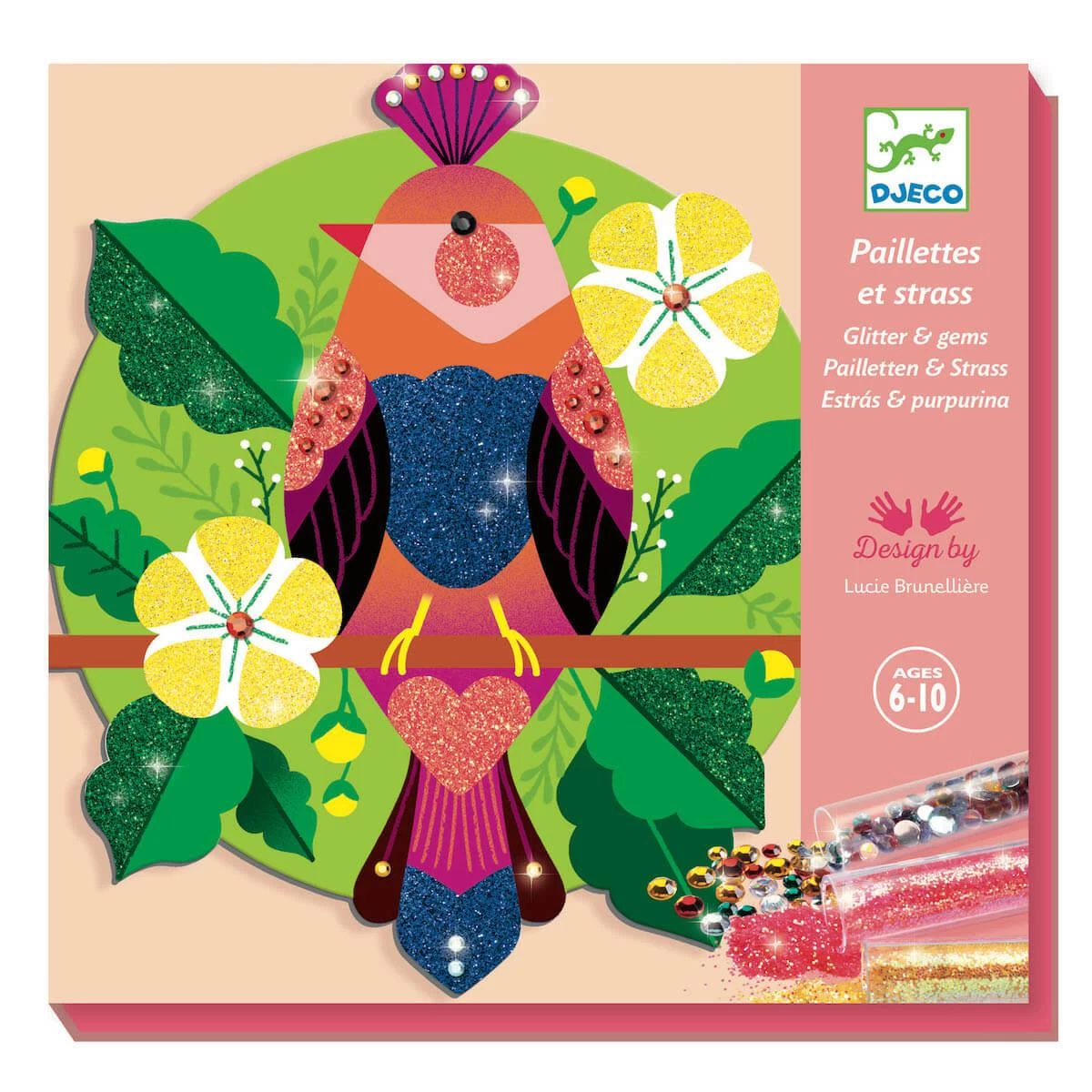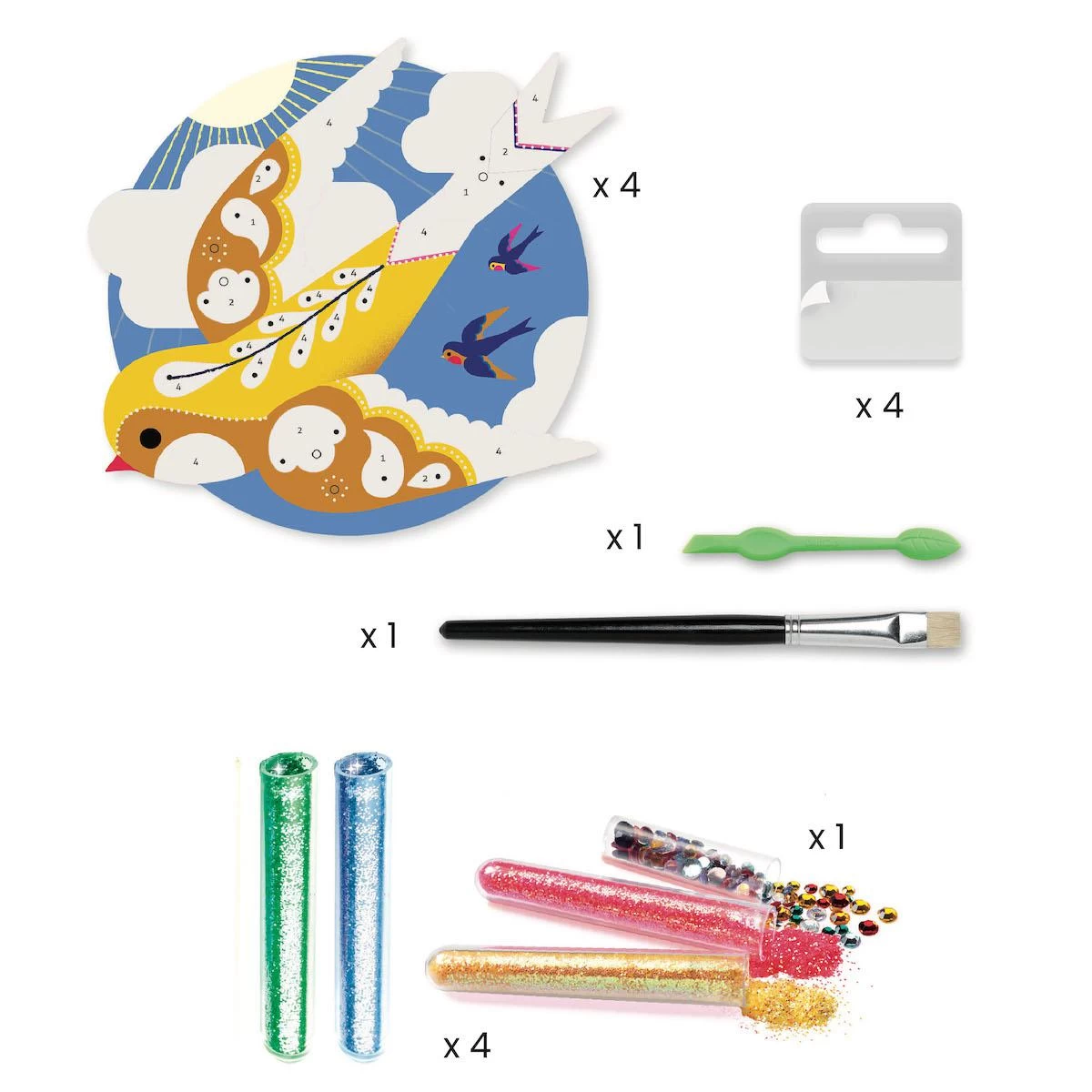 4 tableaux silhouettés en forme de médaillons à illuminer de paillettes et de petits strass. L’enfant place son tableau dans la boîte, dévoile les zones préencollées puis il positionne les strass et saupoudre la poudre pailletée en suivant le code couleurs indiqué dans le livret. Pour exposer ses réalisations, l’enfant fixe les petits crochets de suspension prévus à cet effet au dos des planches. Quelle fierté d’admirer les plumages chamarrés !